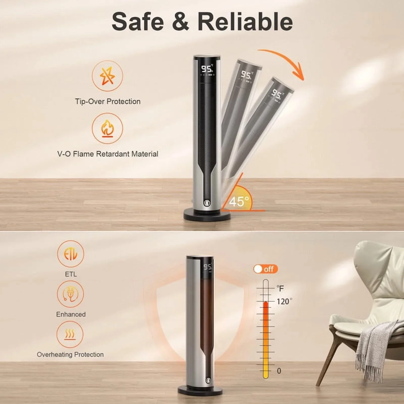 Usage Comfort: The touchscreen is placed on top of the heaters for inside for easier reach, and the remote provides full access from up to 26 feet away. The base diameter of this heater for bedroom is 8.7-inch that this compact design makes our space heater a real space saver that is easy to move around with its hidden handle.